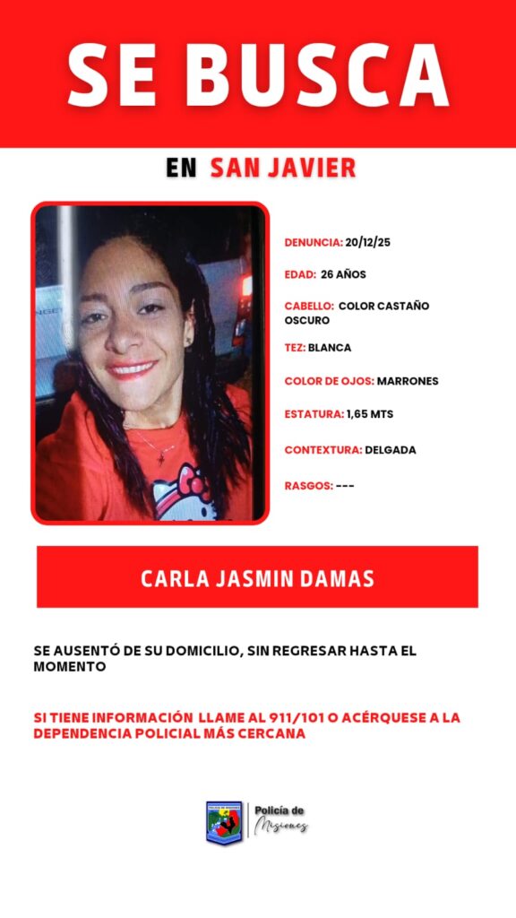 Se busca joven desaparecida en San Javier 20 diciembre, 202520 diciembre, 2025 Se solicita cualquier información sobre el paradero de Carla Jasmin Damas