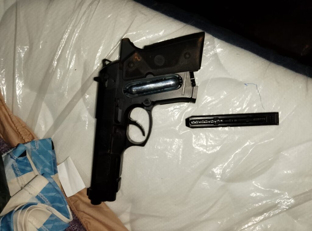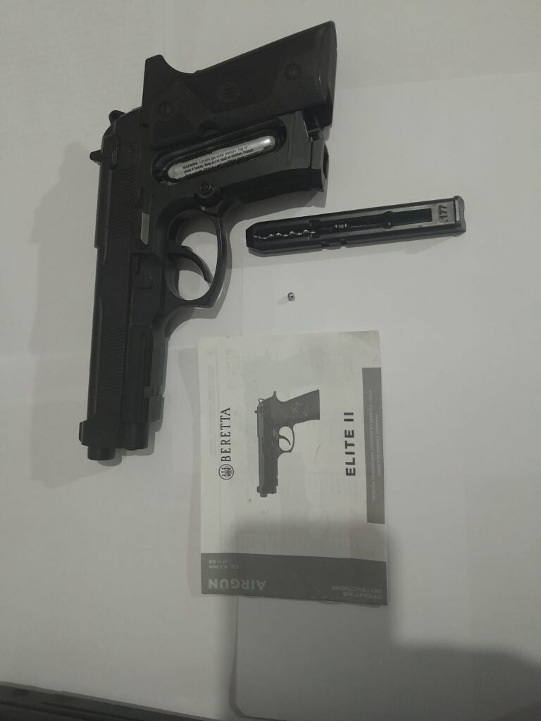 Con base en la investigación preliminar, a las 17:20 horas se ejecutó una Orden de Allanamiento, en un domicilio de la ciudad. Durante la diligencia se procedió al secuestro de una pistola de aire comprimido marca Elite II, calibre 4,5 mm, color negro, con un cargador conteniendo 11 balines y un tubo de gas.