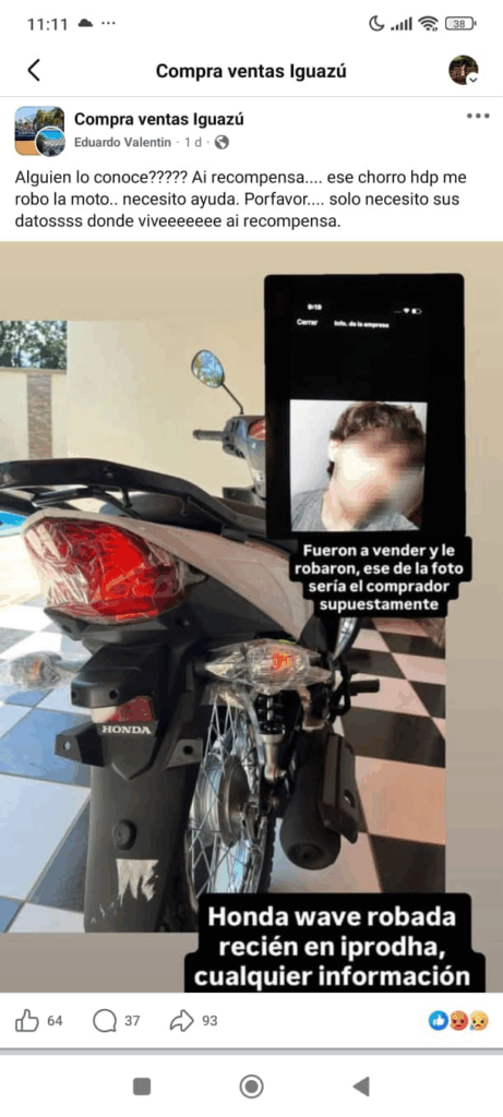La damnificada, una mujer de 31 años, domiciliada en el barrio Belén de Puerto Iguazú, denunció que días atrás había publicado su motocicleta Honda Wave 110 cc en un grupo de compra y venta de Facebook, donde un individuo simuló interés en adquirirla y se dio a la fuga con el rodado.