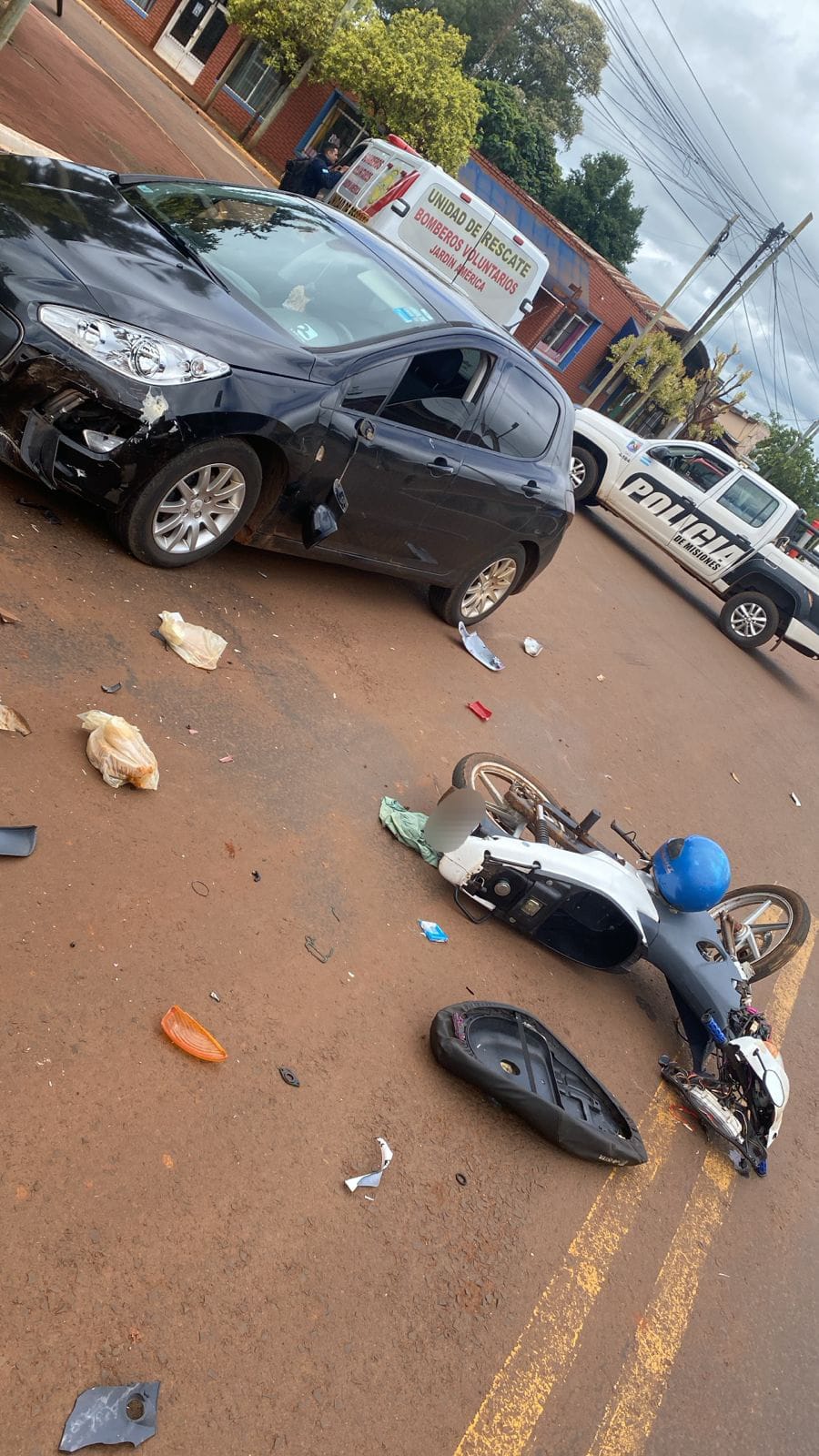 Un siniestro vial se registró este miércoles al mediodía sobre la avenida Islas Malvinas, en la intersección con calle Suriname de Jardín América, donde por causas que se investigan, se produjo una colisión entre un automóvil Peugeot 307 conducido por Ivon R. (58) y una motocicleta Corven Energy guiada por Gladis Marisel B. (36).
