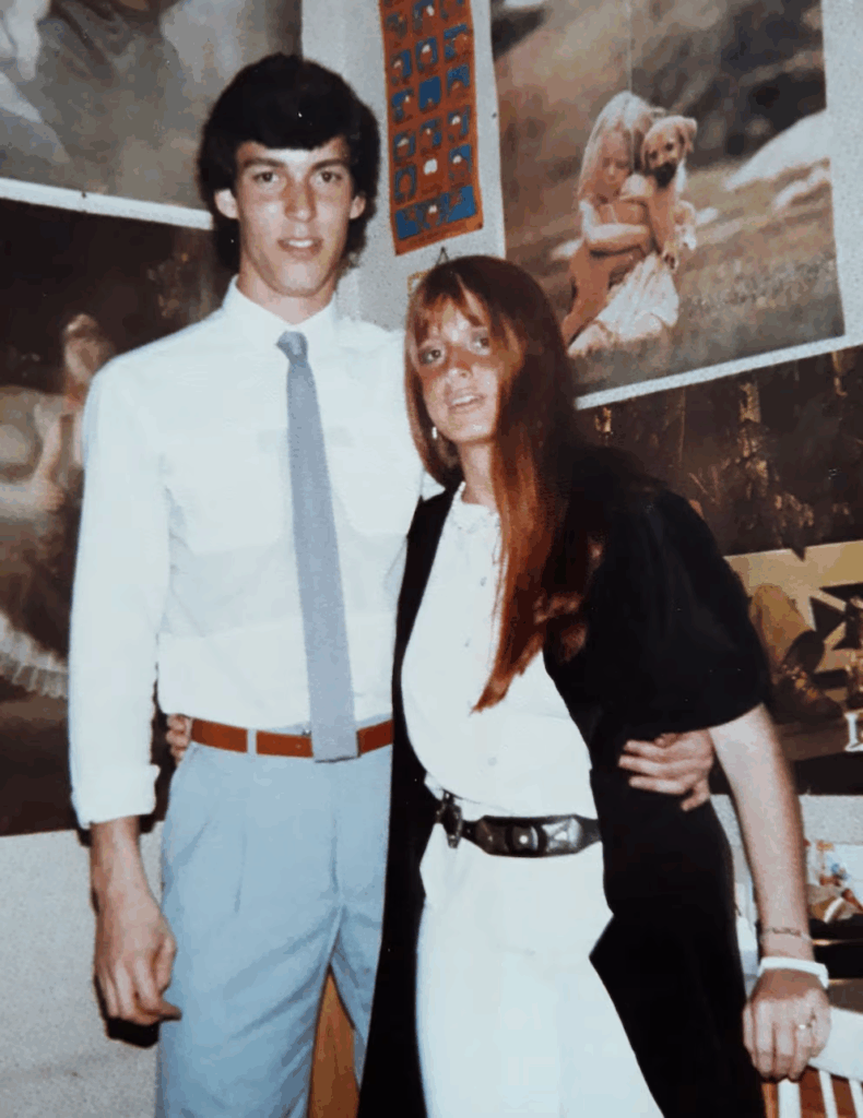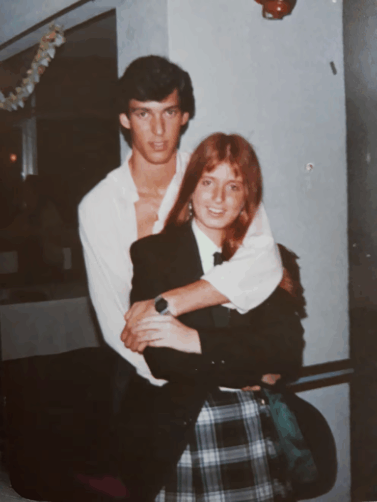 Días de verano, Mar del Plata, 16 de febrero de 1984. Gustavo tiene 16, Laura 15. Salen a bailar con amigos a un club en el Barrio de los Troncos. Laura tenía puesto un pantalón y una campera de jean. Estaba sentada en un rincón. Gustavo se acerca y la saca a bailar. Me impactó de entrada. Tenía un pelo colorado brillante. Y su figura me alborotó la cabeza y las hormonas. ¡Cómo me gustaba! No sabemos de qué hablamos ni qué bailamos, pero no nos separamos hasta el final de la noche. En esa época no había teléfonos celulares ni redes para contactarse con facilidad. Quedamos en encontrarnos en la próxima fiesta en ese mismo sitio. Fue a los pocos días y ahí estuvimos. Pasamos toda la noche juntos otra vez. Bailamos, charlamos y nos besamos por primera vez”.