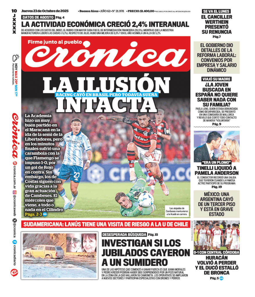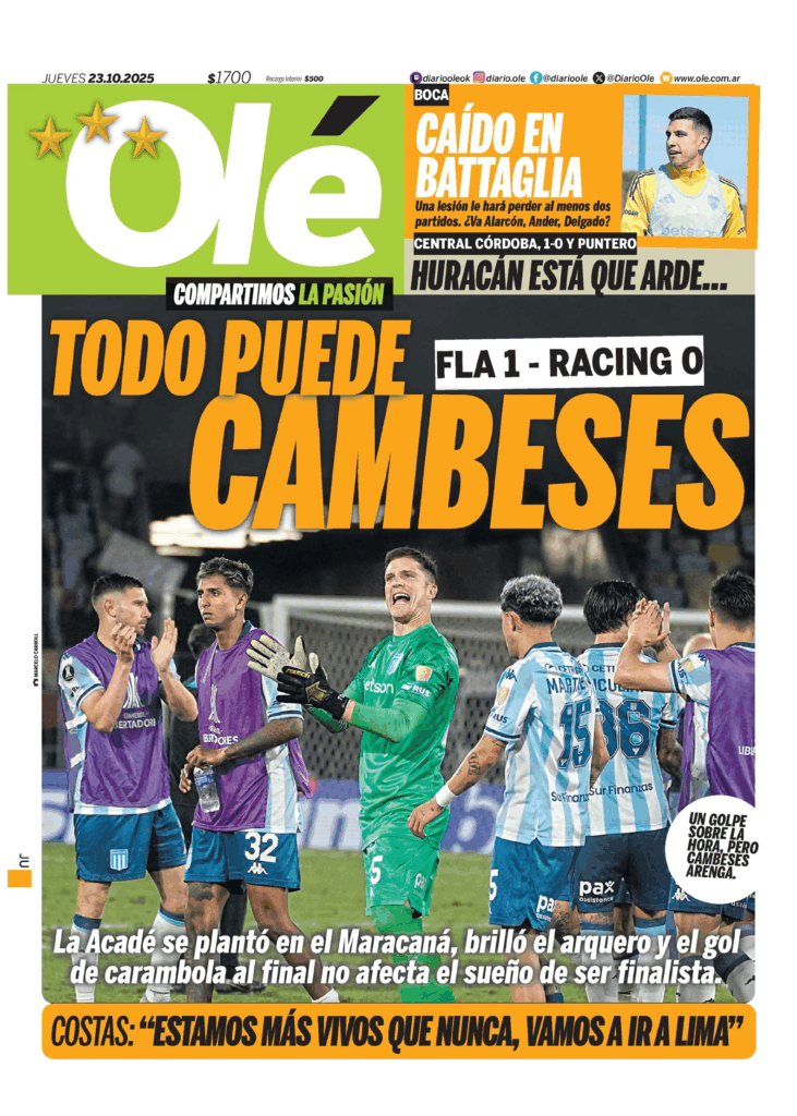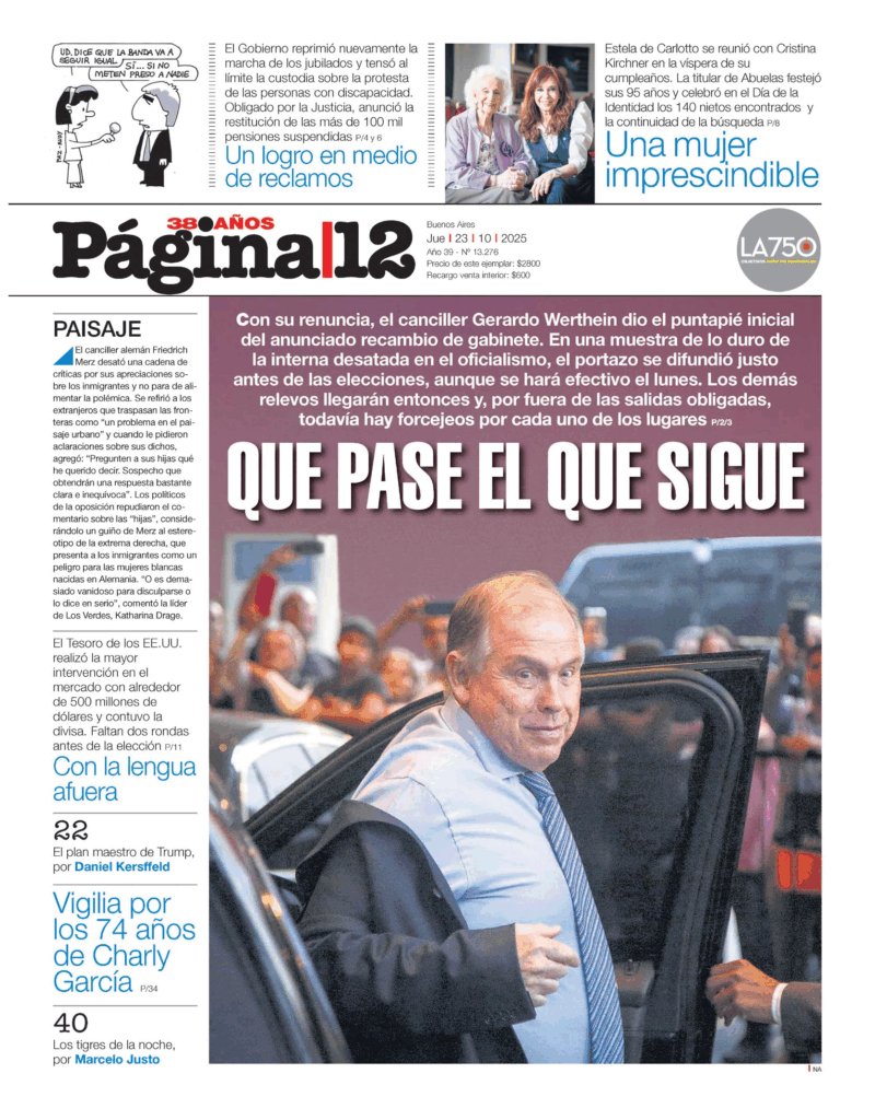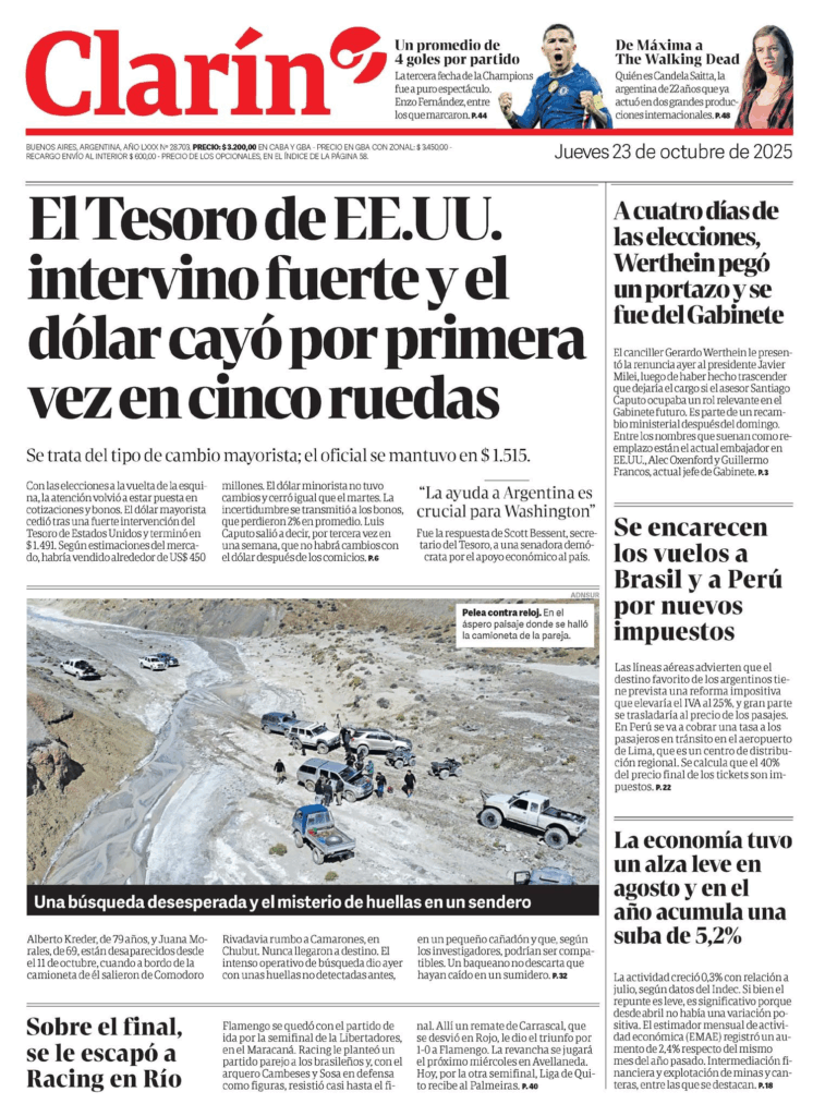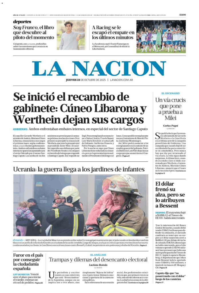 Tapas de los principales diarios nacionales de este jueves 23 de octubre 23 octubre, 202523 octubre, 2025 La Nación Clarín Página 12 Olé Crónica