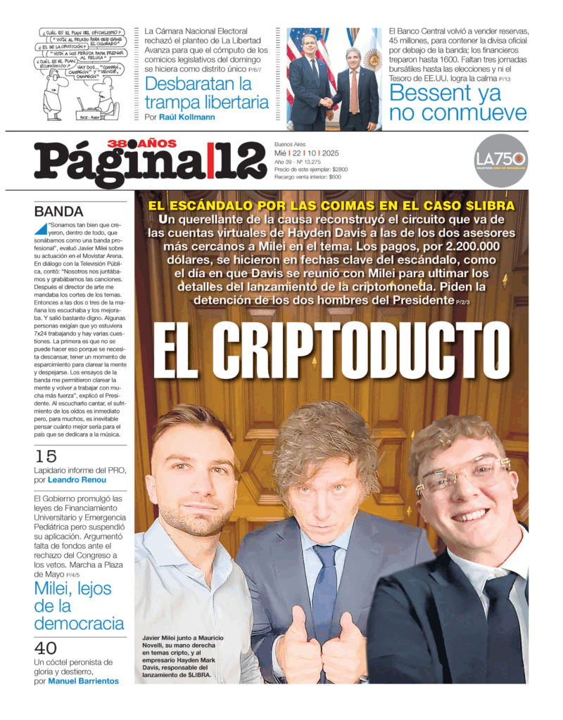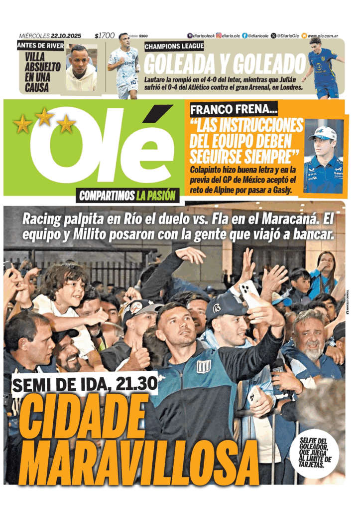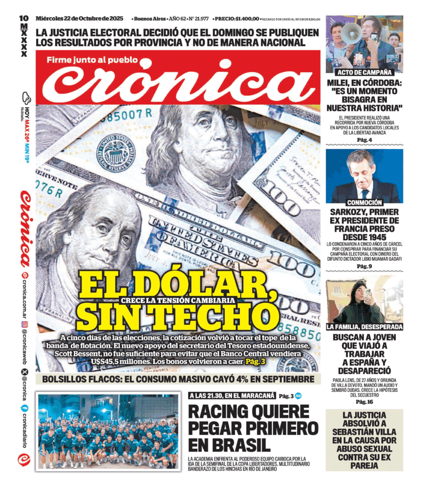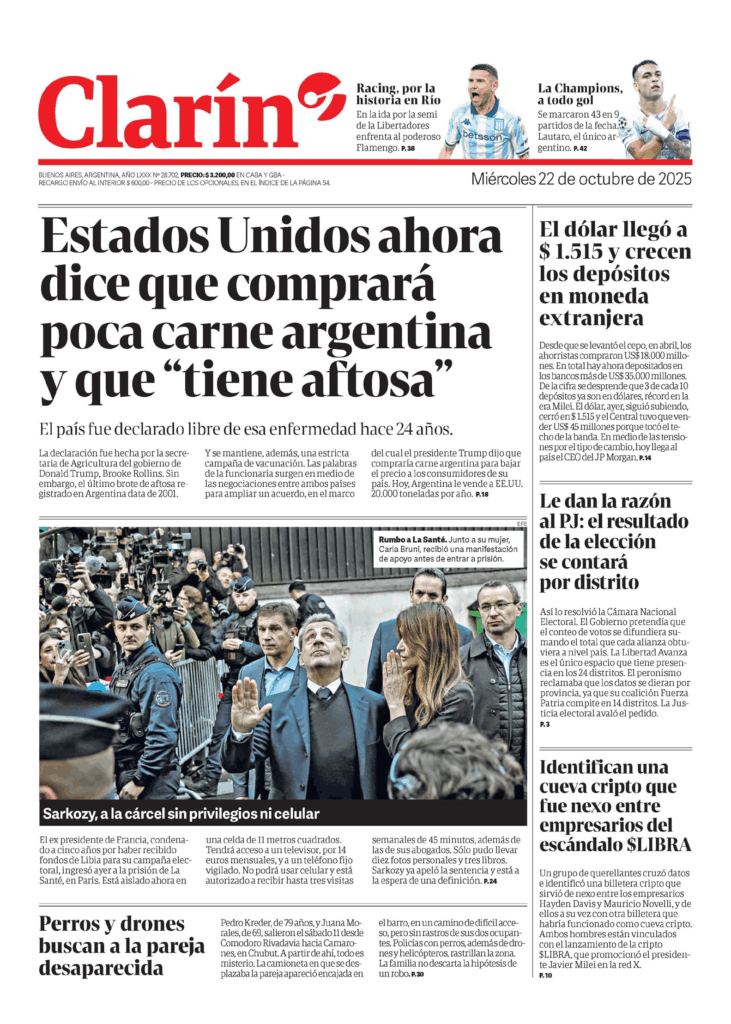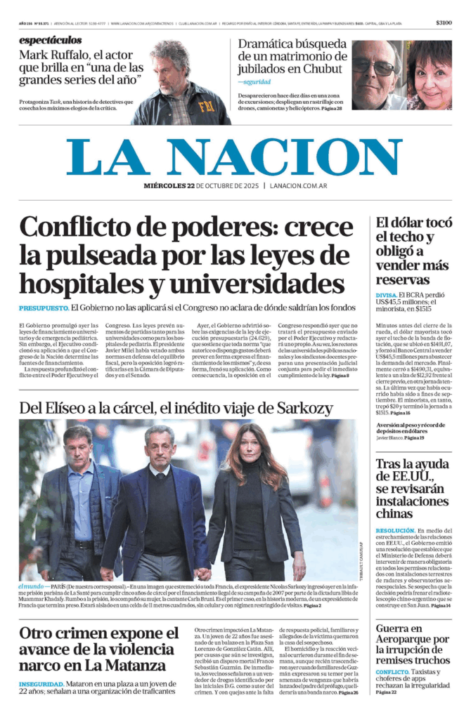 Tapas de los principales diarios nacionales de este miércoles 22 de octubre 22 octubre, 202522 octubre, 2025 La Nación Clarín Página 12 Olé Crónica