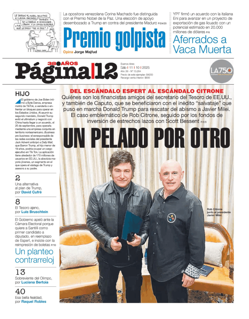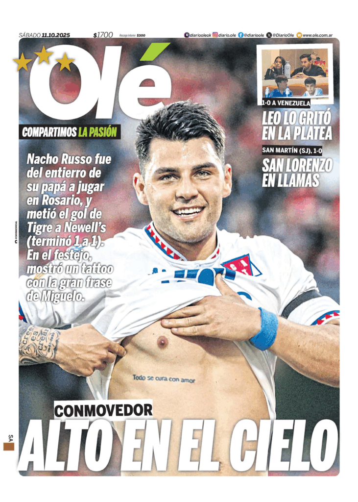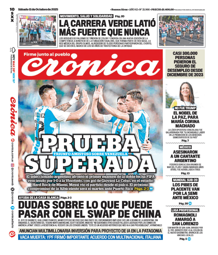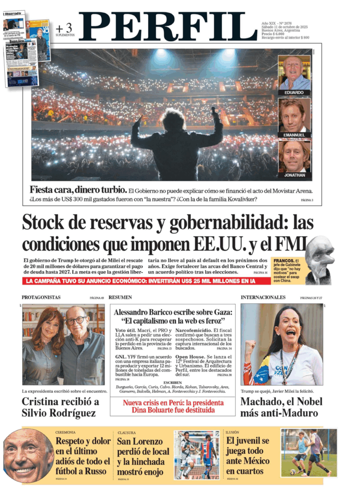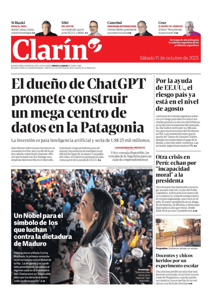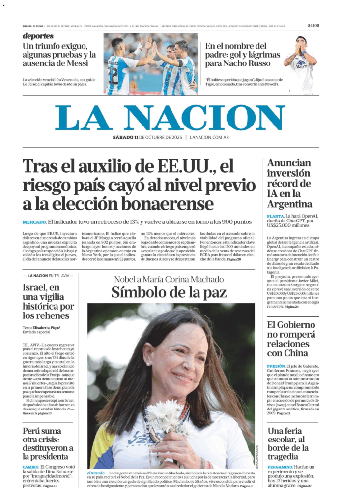 Tapas de los principales diarios nacionales de este sábado 11 de octubre 11 octubre, 202511 octubre, 2025 La Nación Clarín Página 12 Olé Crónica Perfil