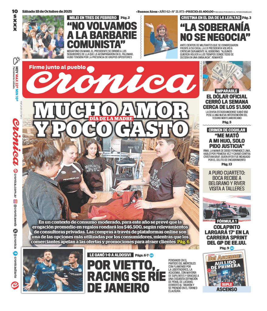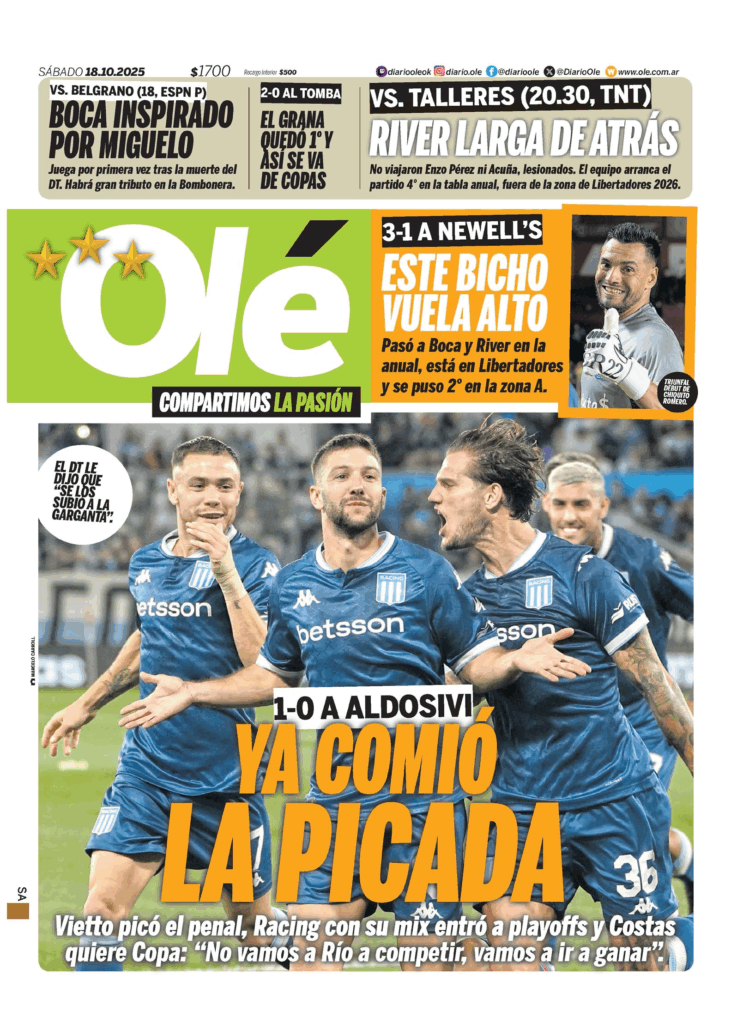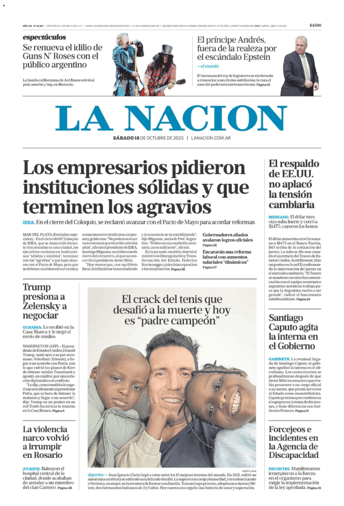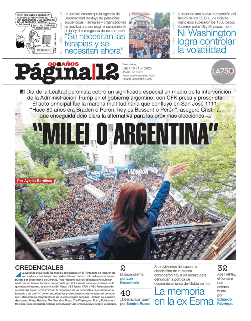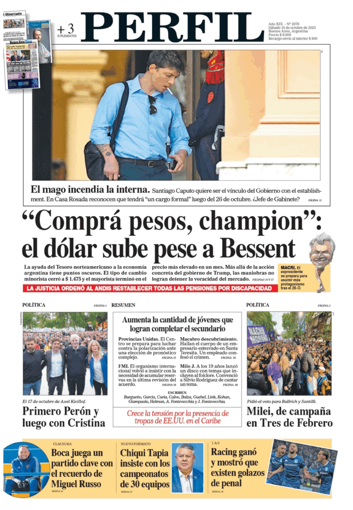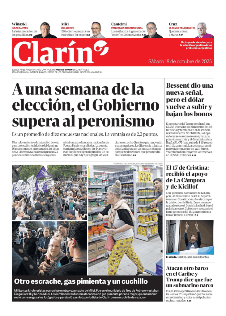 Tapas de los principales diarios nacionales de este sábado 18 de octubre 18 octubre, 202518 octubre, 2025 La Nación Clarín Página 12 Olé Crónica Perfil
