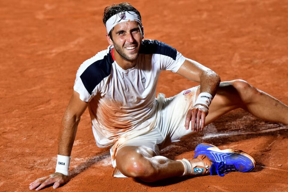Tras el último punto, Tomás Etcheverry se dejó caer sobre el polvo de ladrillo del torneo brasileño e inició el festejo (Fuente: Río Open)