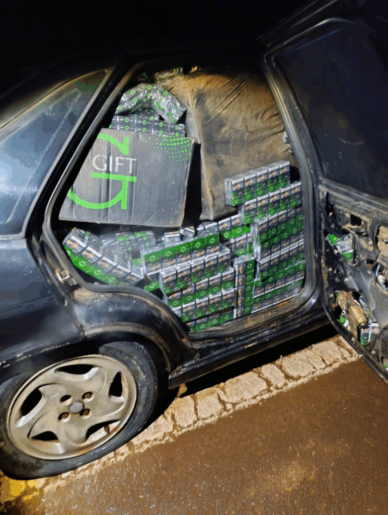 Ante la maniobra evasiva, los agentes iniciaron un seguimiento controlado con balizas y, a unos 3 kilómetros del control, localizaron el vehículo Fiat Supra abandonado entre la vegetación, sin ocupantes. Durante la inspección, constataron que en su interior transportaba 27 cajas de cartón con cigarrillos marca Gift, cada una con 50 gruesas de 10 paquetes, con un aforo total estimado en casi 90 millones de pesos.