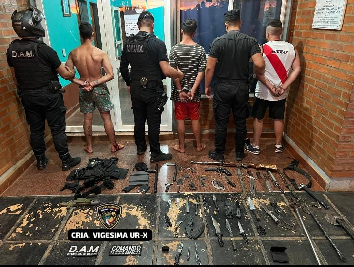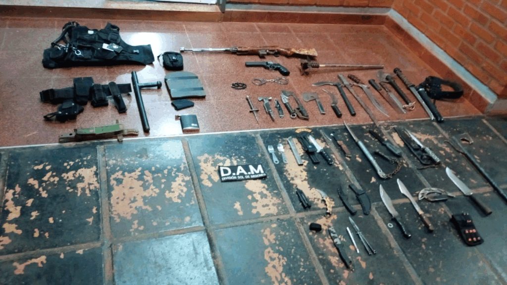El hecho ocurrió en el barrio Sol de Misiones, donde efectivos policiales fueron amenazados y lesionados al intervenir ante un llamado por violencia familiar. Se secuestró un importante arsenal de armas blancas, elementos contundentes y armas de utilería.