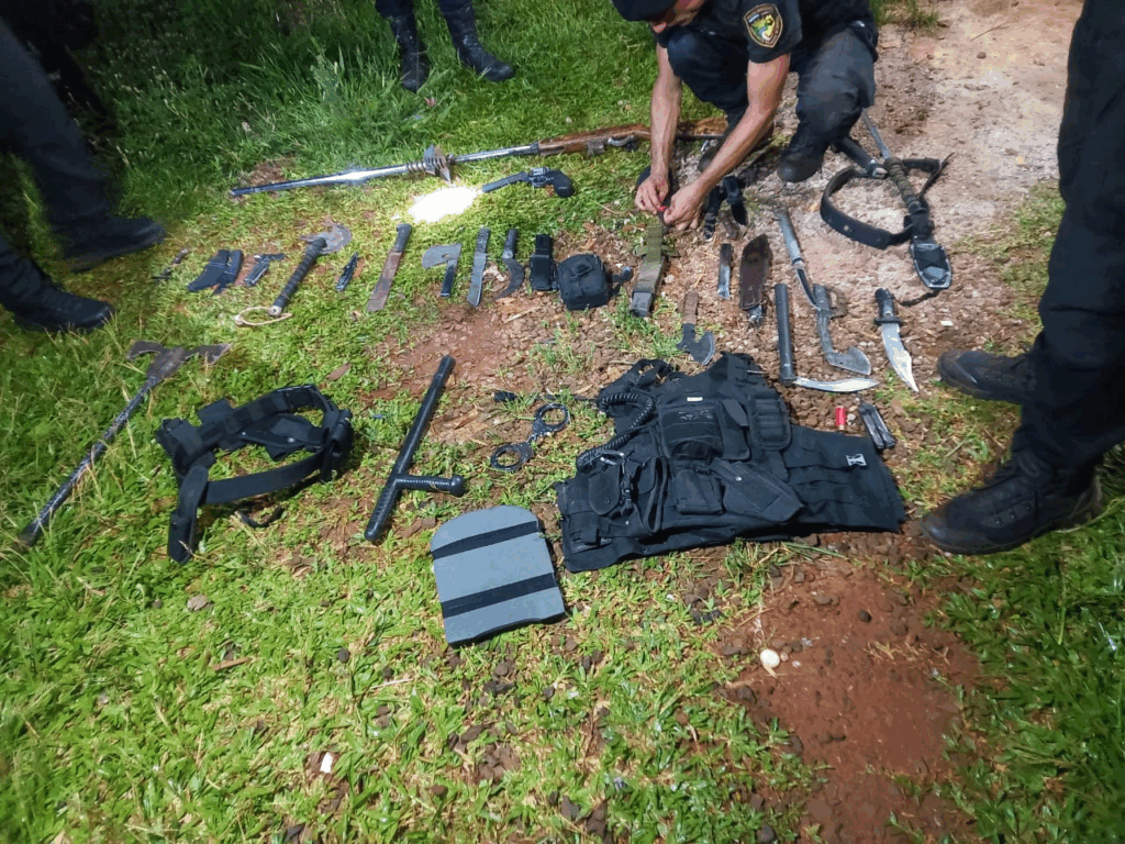 Posteriormente, otros dos hombres armados con hachas, armas blancas y un rifle ingresaron al terreno e intentaron impedir el procedimiento, amenazando al personal policial. Con la autorización expresa de la presunta víctima para ingresar al inmueble, los efectivos irrumpieron en la vivienda y, al proceder a los arrestos, fueron agredidos y lesionados por los atacantes, quienes utilizaron diversos elementos contundentes y armas blancas, entre ellas machetes, puñales y foisas, para resistirse al accionar policial.