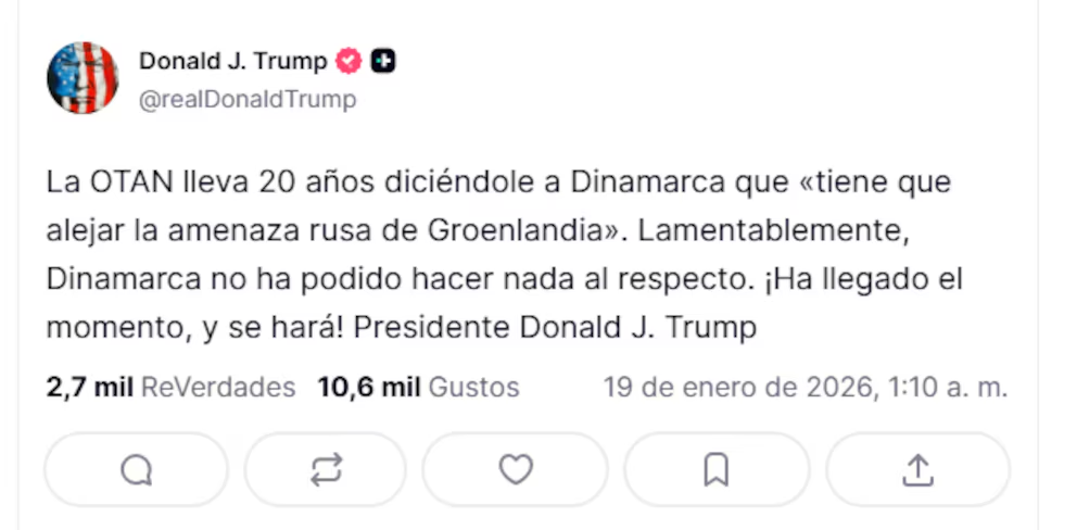 El presidente de Estados UnidosDonald Trump, volvió a exponer su postura sobre Groenlandia al señalar que ha llegado el momento de eliminar la “amenaza rusa” en ese territorio, criticando la gestión de Dinamarca y planteando medidas de presión sobre los aliados europeos. “Durante 20 años, la OTAN le ha dicho a Dinamarca que debe eliminar la amenaza rusa de Groenlandia. Lamentablemente, Dinamarca no ha sido capaz de hacerlo. Ha llegado el momento, y se hará”, afirmó Trump en su red social, Truth Social, en un nuevo episodio de tensiones diplomáticas que involucran a la OTAN, la Unión Europea y varios gobiernos nórdicos.