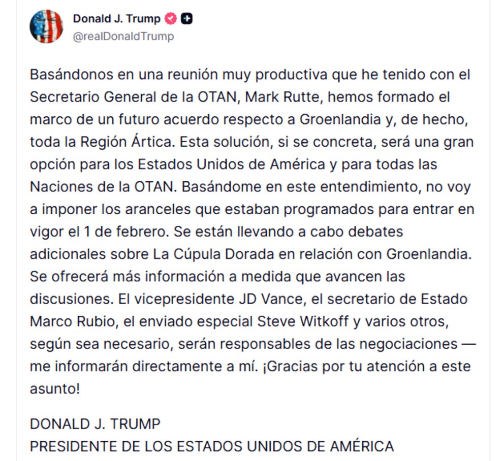 Hemos formado el marco de un futuro acuerdo con respecto a Groenlandia y, en realidad, a toda la región ártica. Esta solución, si se lleva a cabo, será muy beneficiosa para los Estados Unidos de América y para todos los países de la OTAN”, afirmó Trump.