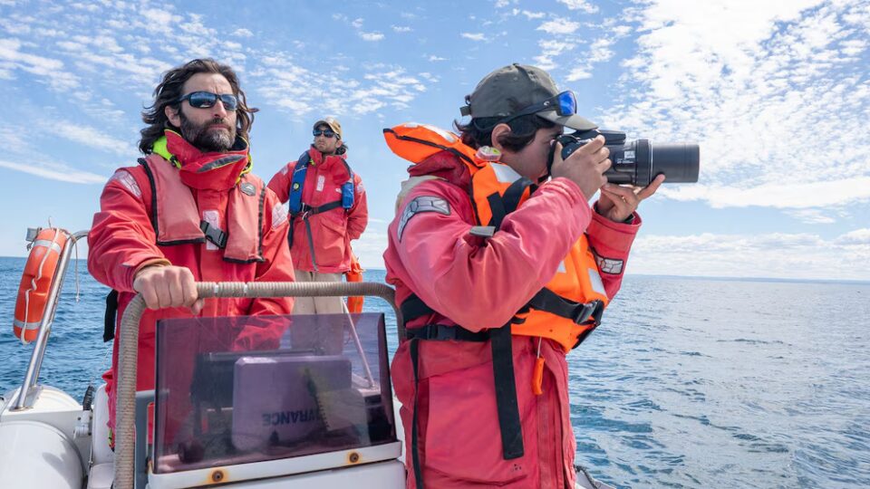 En el timón está Lucas Beltramino, licenciado en Ciencias Biológicas, buzo profesional y navegante. Actualmente es responsable del programa de monitoreo de ballenas, de tareas técnicas y científicas y de actividades náuticas en el Proyecto Patagonia Azul de Rewilding Argentina. Lo acompaña Tomás Tamagno,otro joven biólogo, que también forma parte del equipo.