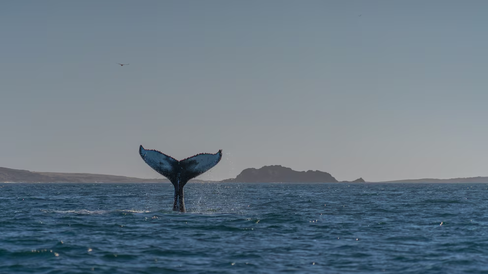 Finalmente, la vemos. Una ballena jorobada. Asoma la cola y vuelve a sumergirse. Es un instante, pero alcanza para fotografiarla y filmarla. Lo más impactante llega después. El mar queda completamente liso, como una hoja. No hay olas, no hay movimiento: solo una superficie quieta.