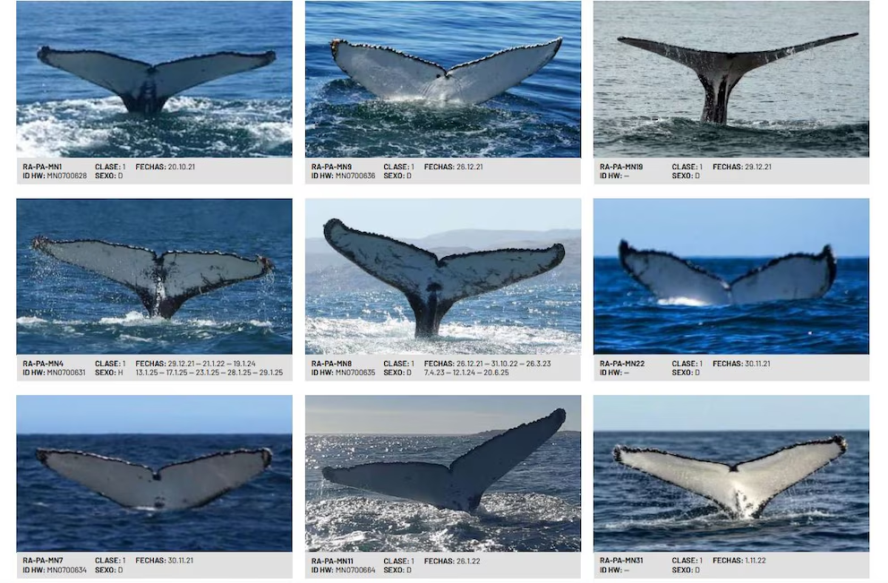 La cara inferior de la cola de cada ballena tiene patrones únicos: es su “huella digital”. No hay dos iguales. Como el sexo no siempre puede determinarse, hay varias que figuran como “D” (desconocido) en el catálogo (Foto/Captura)