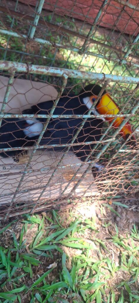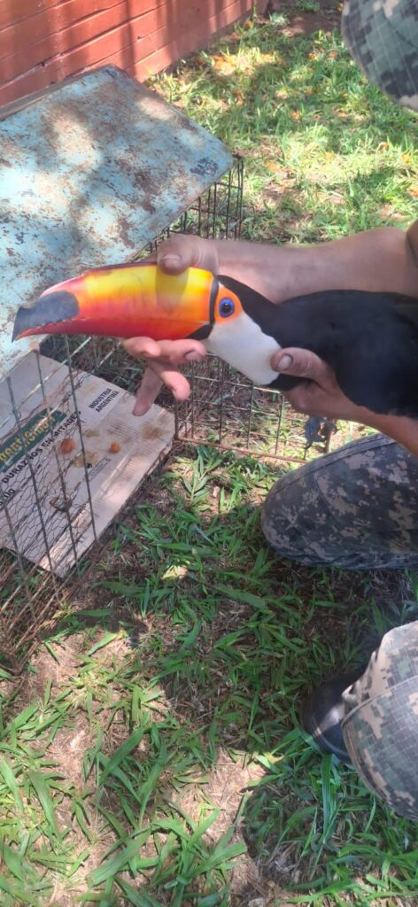 Al llegar al lugar constataron que se trataba de un tucán (Ramphastos toco) que presentaba signos de lesión y que corría riesgo al permanecer a nivel del suelo. Por tal motivo los efectivos procedieron a su resguardo, colocando al ave en un contenedor de transporte para evitar mayores daños.