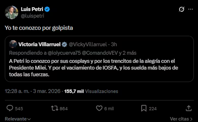 Tras ello, una usuaria se preguntó por el quiebre en la relación de lo que fue la dupla presidencial en 2023 y Villarruel redobló la apuesta contra Petri y el Presidente. “A Petri lo conozco por sus cosplays y por los trencitos de la alegría con el Presidente Milei. Y por el vaciamiento de IOSFA, y los sueldos más bajos de todas las fuerzas”, esgrimió.