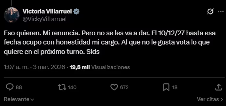A su vez, otro usuario le pidió que renunciara, a lo que la vice respondió: “Eso quieren. Mi renuncia. Pero no se les va a dar. El 10/12/27 hasta esa fecha ocupo con honestidad mi cargo. Al que no le gusta vota lo que quiere en el próximo turno”.
