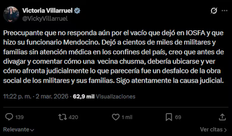 Según reclamó Villarruel, esa acción “dejó a cientos de miles de militares y familias sin atención médica en los confines del país” y sostuvo que “antes de divagar y comentar cómo una vecina chusma, debería ubicarse y ver cómo afronta judicialmente lo que parecería fue un desfalco de la obra social de los militares y sus familias”.